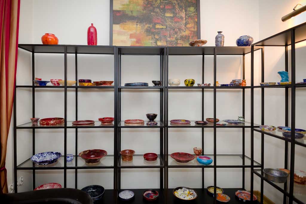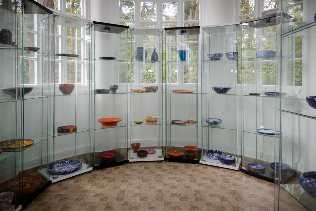 To część przestrzeni dedykowanej w moim pięknym, starym domu na ekspozycję ceramiki. Mojej pasji. To także kilka półek w pracowni, gdzie znajdują się rzeczy jeszcze surowe które można poszkliwić, czyli nadać im kolor wg życzenia. To miejsce spotkań przy kawie, herbacie lub lampce wina. Ekspozycja zmienia się nieustannie ponieważ tzw. ,,produkty” (brr -nie lubię tego określenia) sprzedają się i trzeba je zastępować nowymi. Galeria rozprzestrzenia się do ogrodu. Od wiosny.