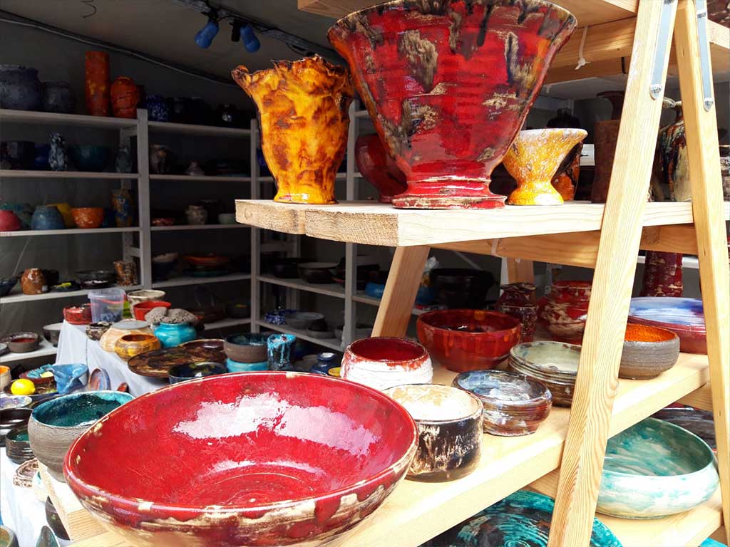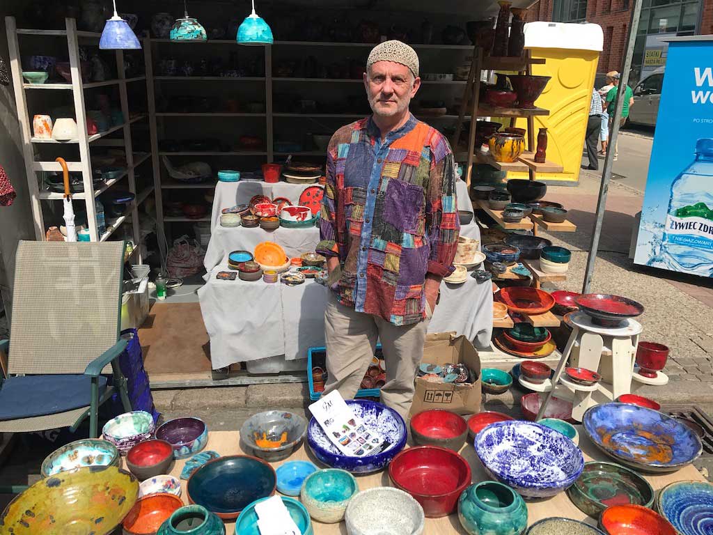 Współpracujemy czasami przy produkcji pachnących świeczek. Ja dostarczam im czarki a oni robią czary-mary. Obok, przez brezentową ścianę namiotu wystawowego zawsze uśmiechnięty i przesympatyczny Janek, wyglądający jak z Marakeszu. Sprzedający bluzy, koszule i spodnie szyte gdzieś przez Nepalczyków. Zawsze jestem jego wiernym klientem. Naprzeciwko energiczny i wesoły Bartosz. Kiedyś pływał na statkach turystycznych. Zawsze z dobrą muzyką i piwem, które sam warzy. Są też co roku tzw. hippisi, dojrzała para, która się odnalazła wzajemnie po latach i stworzyła wspaniały związek dwojga ludzi wytwarzają produkty ze skóry. Była także pani ,,od Aniołów”. Piękne płaskorzeźby wykonane z drewna przebywającego dziesiątkami lat w morzu lub rzekach.