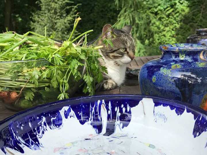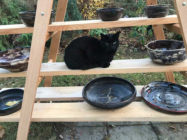 Widzieliście pewnie filmiki na YouTube czy na Facebooku jak kot potrafi przejść poprzez rzędy miseczek czy czarek nie potrącając żadnej. No chyba, że ma na to ochotę, wtedy nic na to nie mogą poradzić. Czarki lub wazony, szczególnie te stojące na brzegu blatów czy półek lądują na ziemi. Koty lubią pić wodę deszczową z misek. Ptaki i jeże też. Często pozują mi do zdjęć. Nigdy nie wiem na pewno czy jeśli ktoś polubi takie zdjęcie, to bardziej moją ceramikę czy też kota. Zresztą nie mam wątpliwości, że bardziej kota. Odwiedzają mnie w pracowni. Lubią tam przebywać szczególnie jak jest zimno na zewnątrz, a piec jest jeszcze ciepły. Moje koty są zaprzyjaźnione z moją ceramiką. Żyję z kotami. Ale chyba ich nie znam dogłębnie.