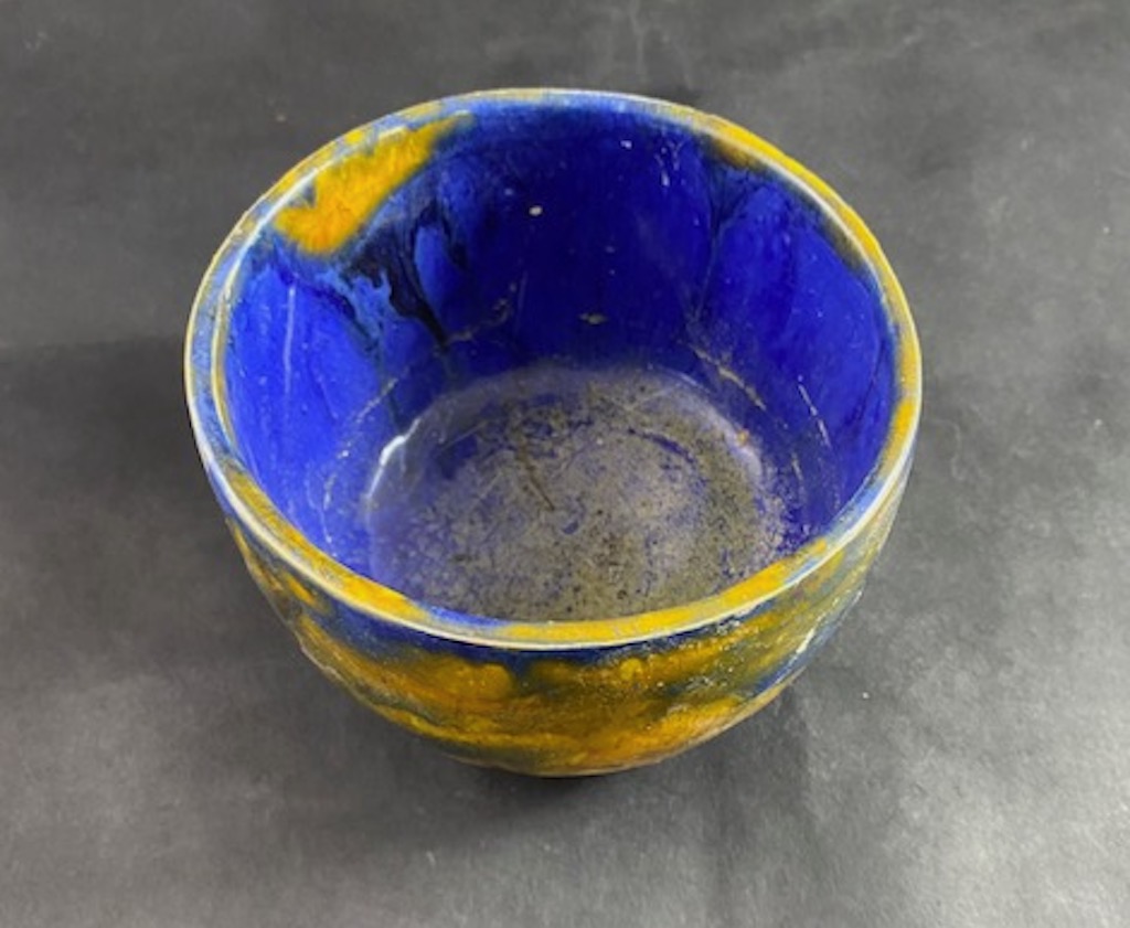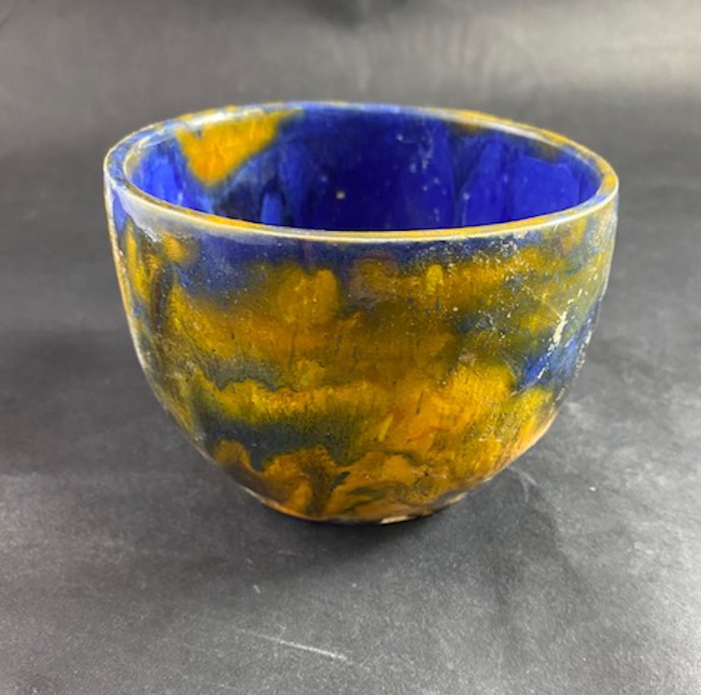 Ceramiczny przedmiot mogący służyć także za osłonkę do doniczki lub naczynie ma małe przedmioty. Stworzony w pracowni Gary Misaki w Józefowie.Wielokolorowa.