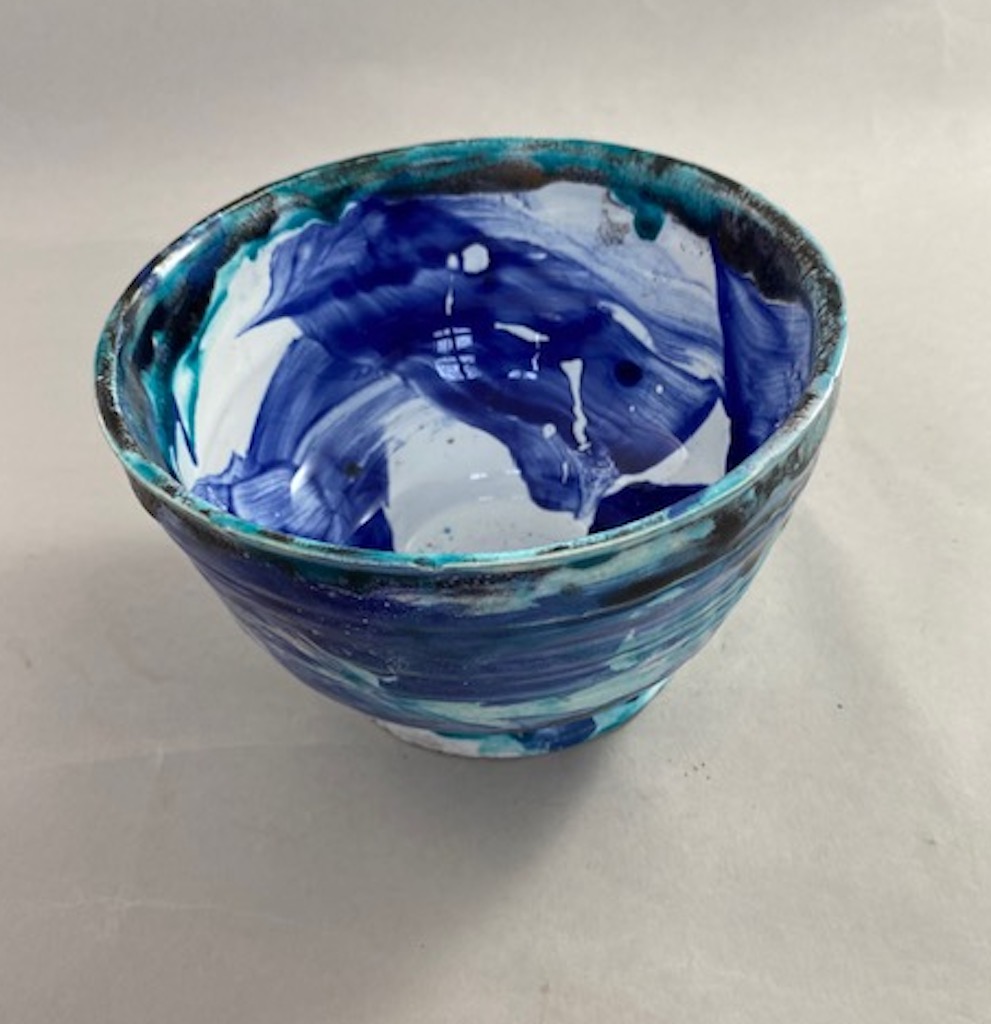 Ceramika artystyczna ceramika użytkowa. Ceramiczna pucharek wykonany ręcznie z białej gliny, wytoczony na kole garncarskim, poszkliwiony. Wysokość 9 cm, średnica 15cm. Wielokolorowy.