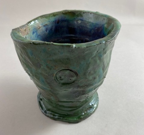 Kielich – pucharek niebieski, wytoczony na kole, poszkliwiony, wysokość 13cm, średnica 12cm.