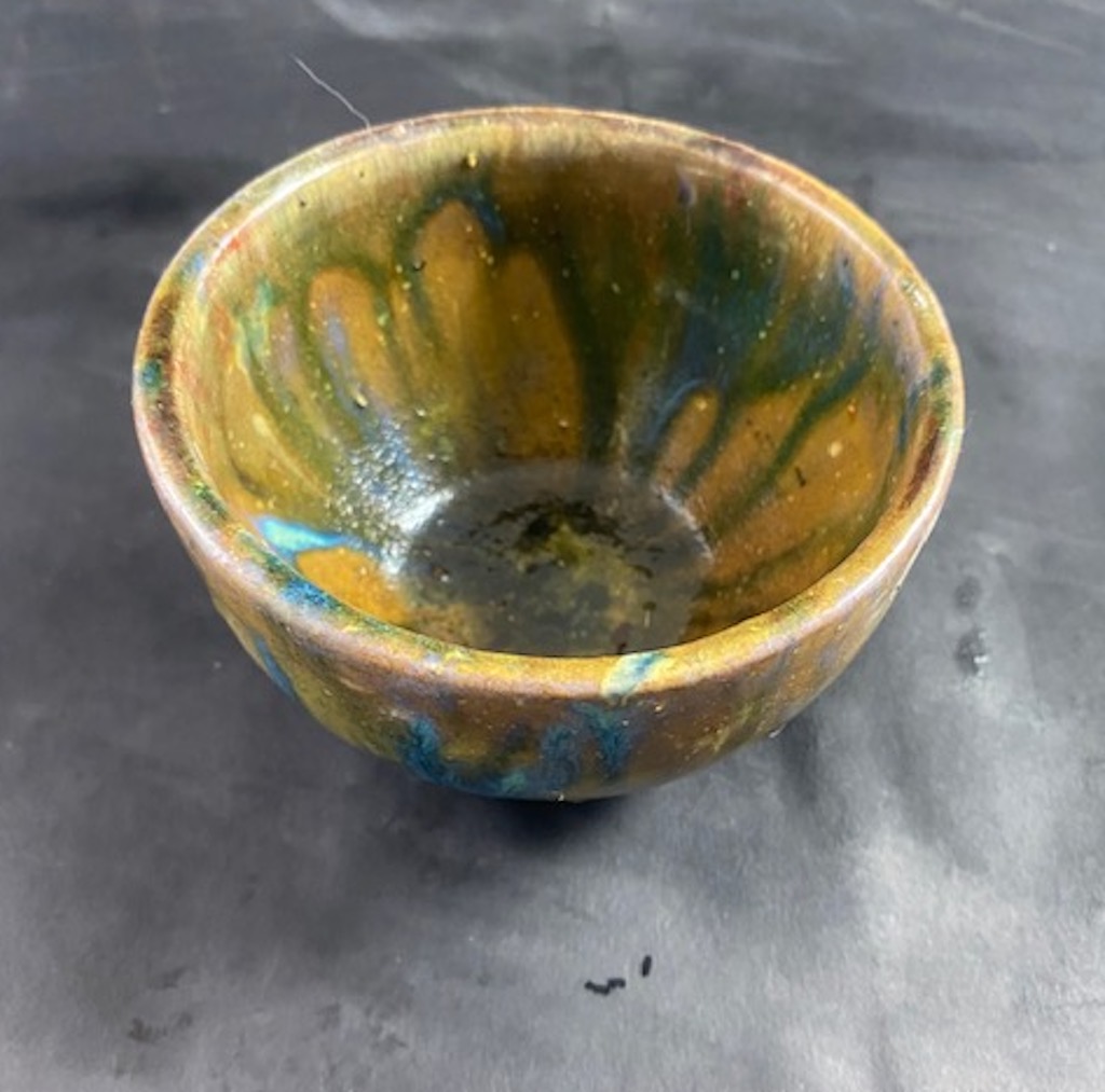 Ceramiczny przedmiot mogący służyć także za osłonkę do doniczki lub naczynie ma małe przedmioty. Stworzony w pracowni Gary Misaki w Józefowie.Wielokolorowa.