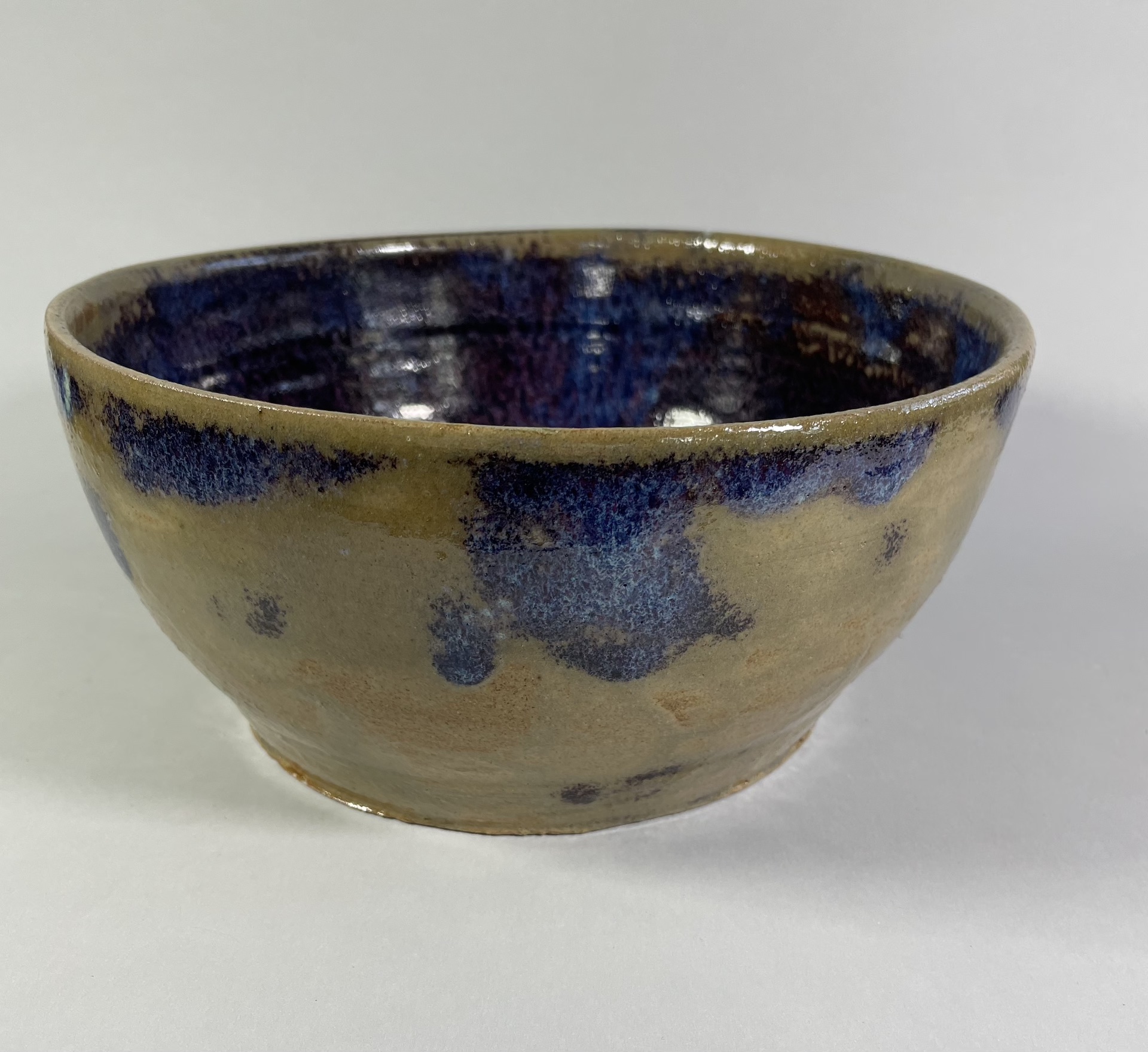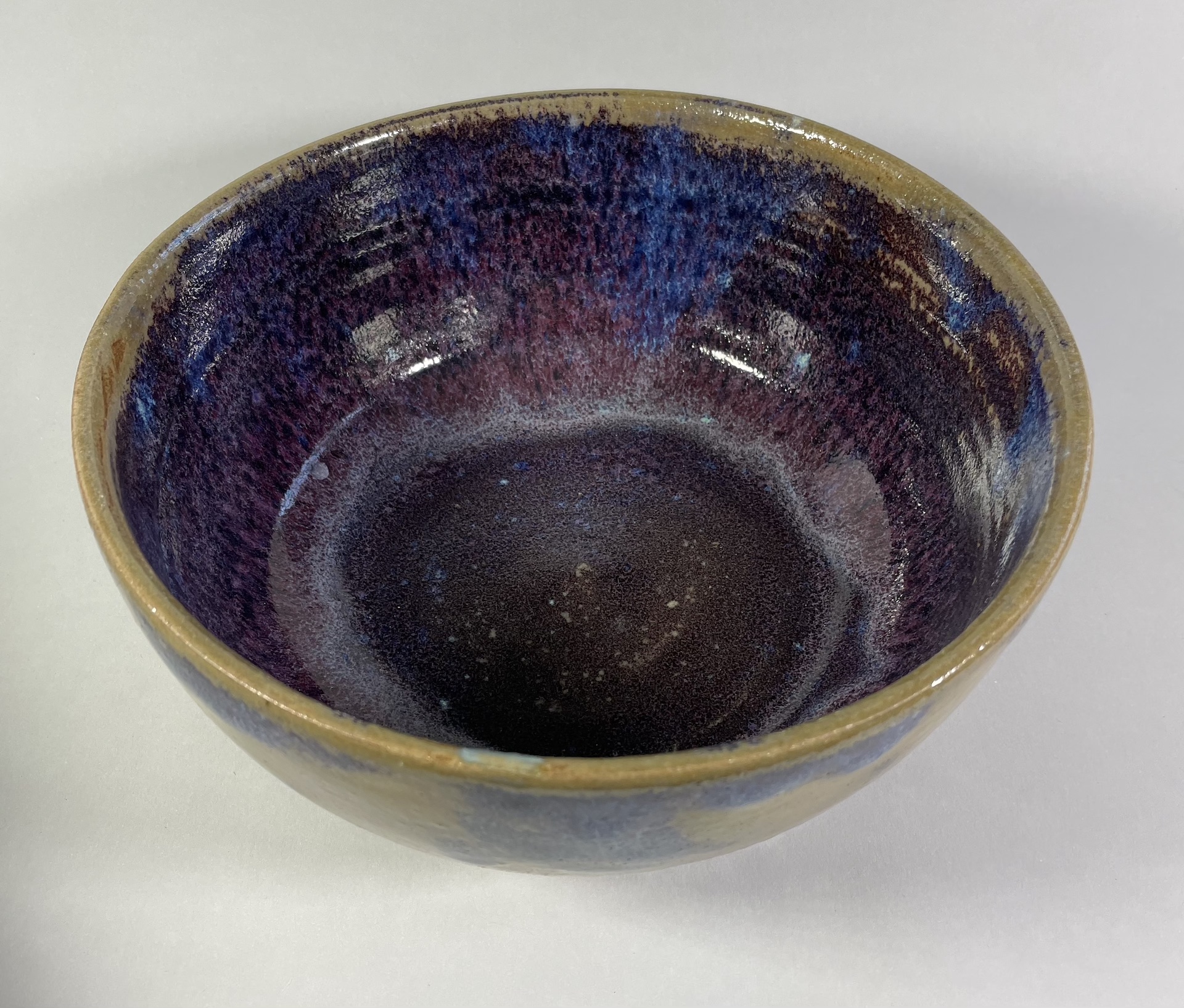 Ceramika artystyczna ceramika użytkowa. Brązowo-zielona z jagodowymi plamami, w środku jagodowo-niebieska. Średnica 23 cm, wysokość 10,5 cm.