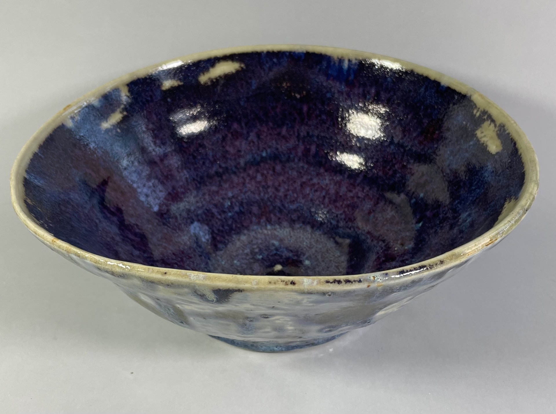 Ceramika artystyczna ceramika użytkowa. Ceramiczna Miska, wykonana ręcznie z grubej, jasnej gliny, wytoczona na kole garncarskim, poszkliwiona. Niebieska z białymi plamami, w środku jagodowo-niebieska. Użytkowo-dekoracyjna. Wysokość 10 cm, średnica 25,5 cm.