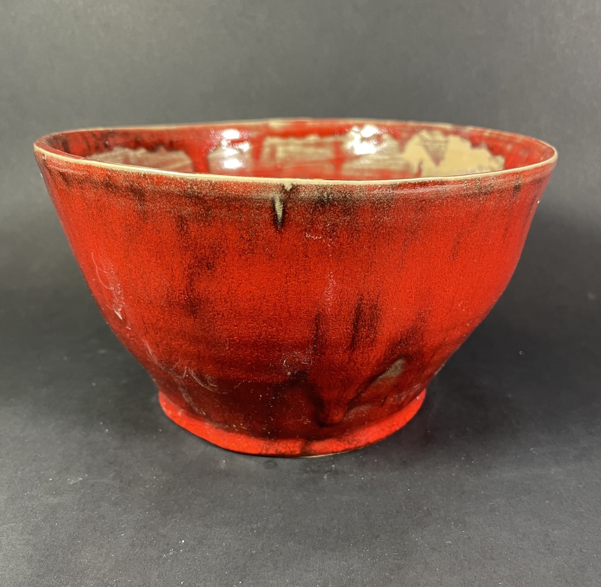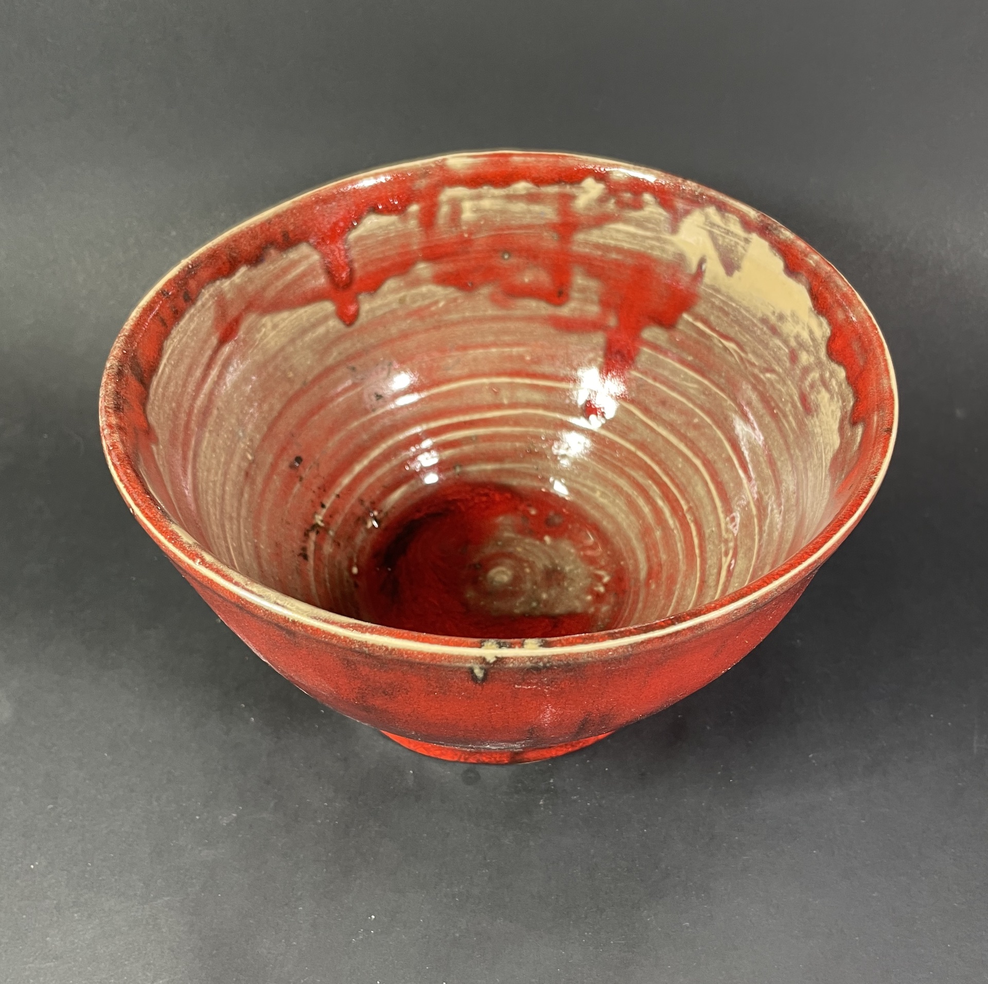 Ceramika artystyczna ceramika użytkowa. Misa, waza czerwona, ceglasta. Białe wybarwienia w środku Wysokość 11 cm, średnica 18 cm.
