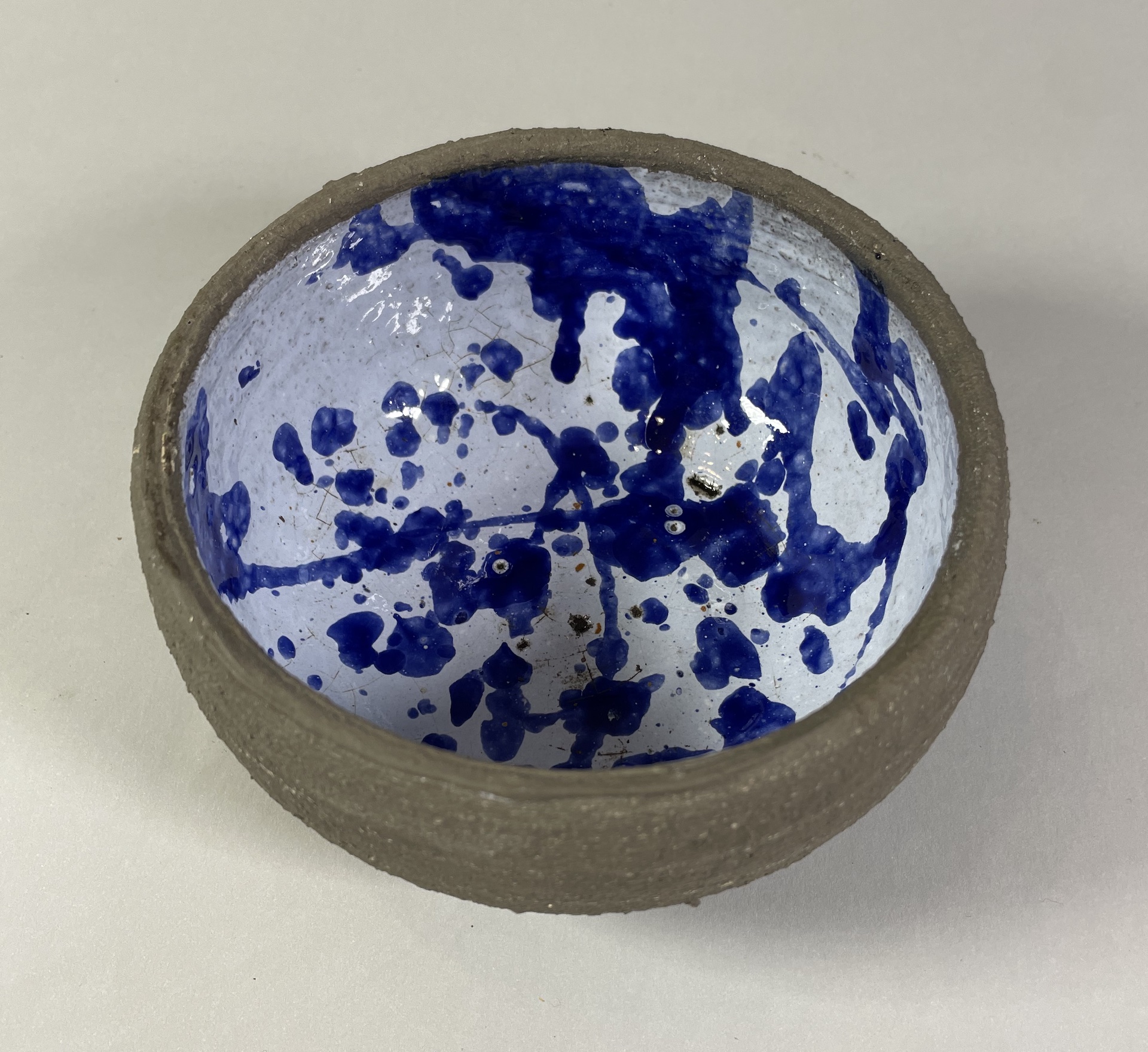 Miseczka surowa glina, szaro-brązowa. W środku biało kobaltowa.