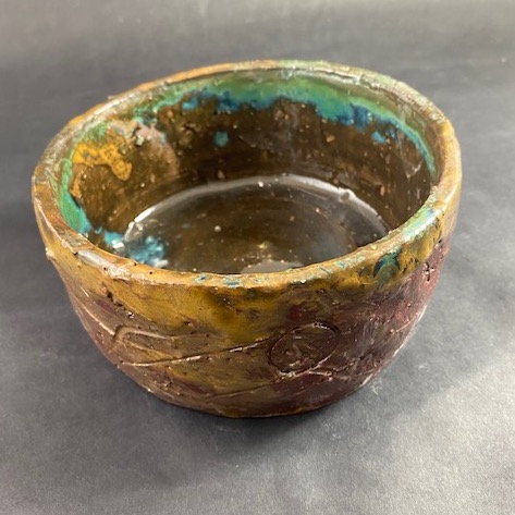 Wytoczona na kole garncarskim, poszkliwiona. Wysokość 7 cm, średnica 16 cm. Złoto miesza się z herbacianym brązem na zewnątrz.W środku miodowo turkusowa.